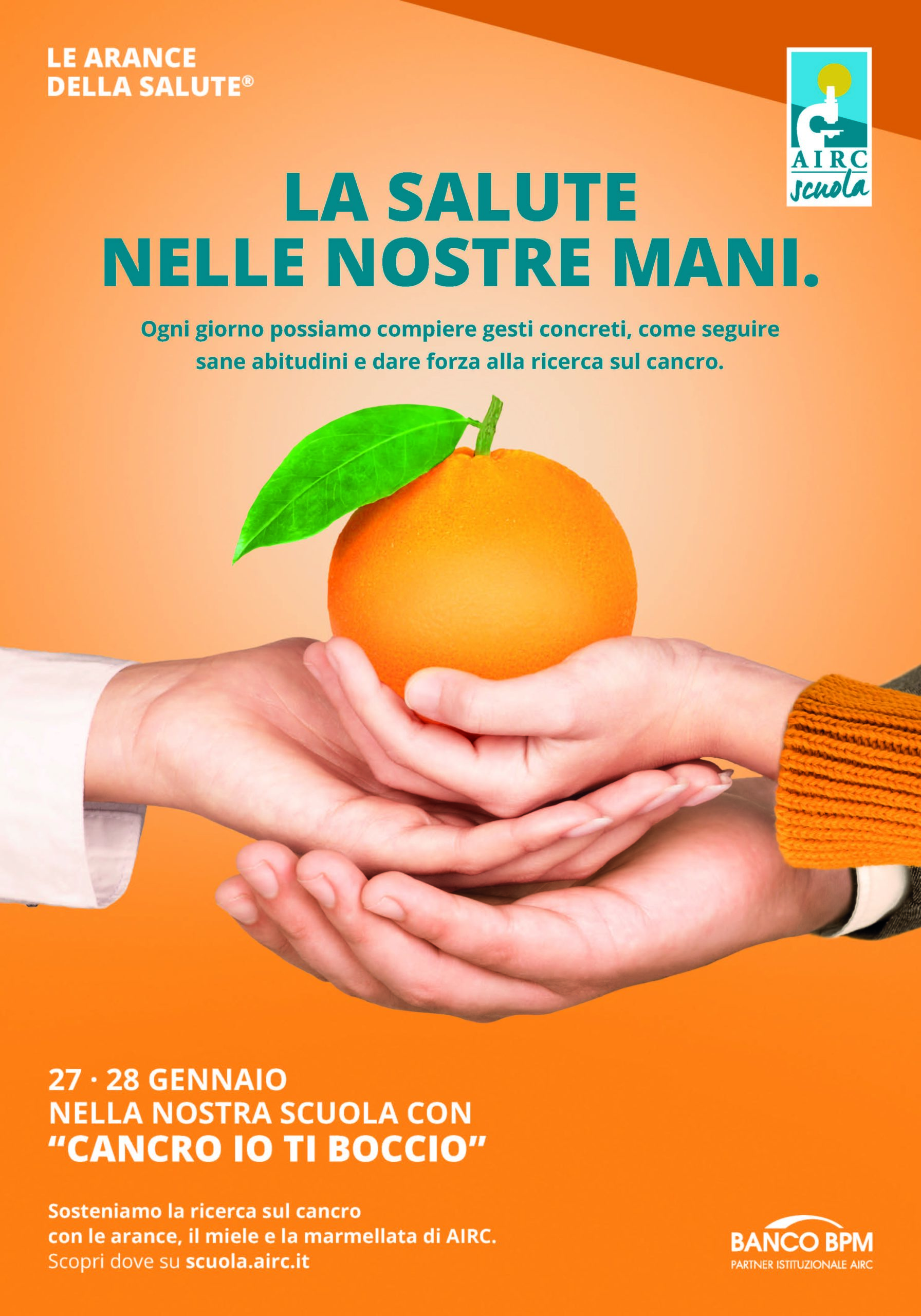 Come ogni anno il Nostro Istituto aderisce a “Cancro io ti boccio”, il progetto che AIRC ha studiato appositamente per le scuole che vivono un’esperienza di cittadinanza attiva con percorsi ludici e di riflessione su sani stili di vita a partire dal tema dell’alimentazione. La distribuzione delle arance della salute nella nostra Scuola nelle giornate del 27 e 28 gennaio, verrà gestita dagli studenti stessi sotto la supervisione di alcuni docenti per sensibilizzare i ragazzi al tema del volontariato. Con il ricavato AIRC finanzia i progetti di ricerca più innovativi svolti nelle principali istituzioni italiane e assegna borse di studio a giovani laureati che si vogliono specializzare in oncologia.