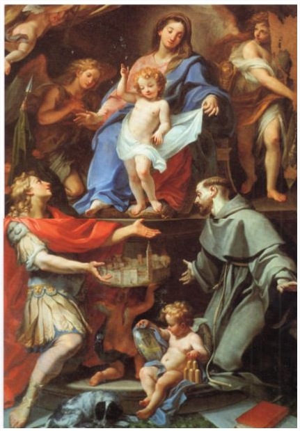 The Cherub, sitting at the base of the painting, holds with his hand the six gold hills depicted in the coat of arms of Monte San Vito. Monte San Vito, being declared imperial territory in the mid-12th century, is represented by the highest hill dominating the other neighbouring hills. With the other hand, the Cherub, holds the coat of arms of the work clients, the order of the Franciscans.